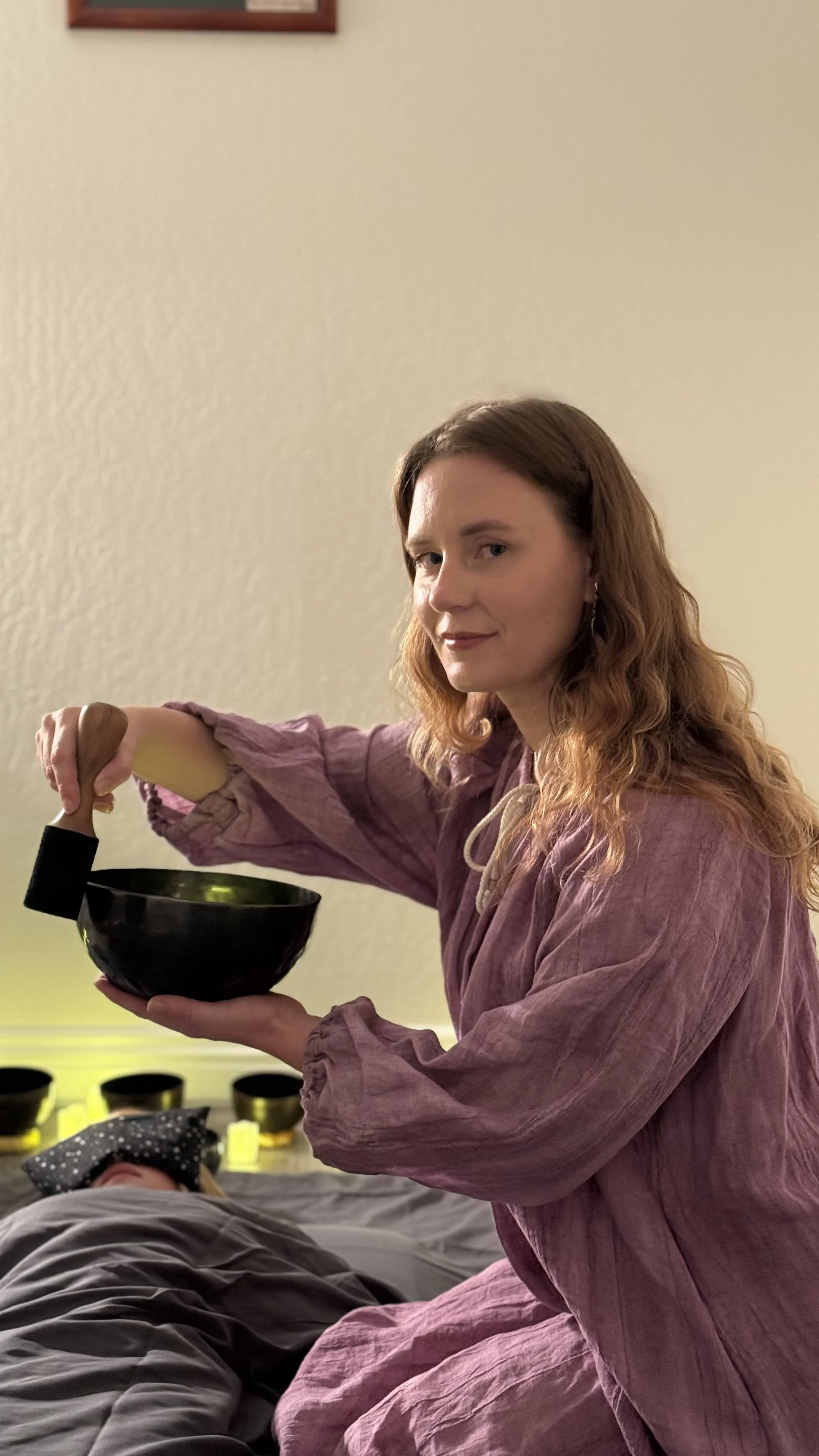 You lie on a mat, fully clothed. A soft blanket. Eyes closed. Hand-hammered singing bowls are placed on and around your body. Rich, resonant tones travel through the skin, muscles, and bones.